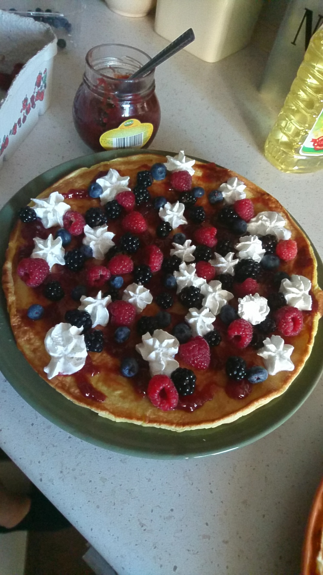 Omlecik z 4 jajek, dwóch łyżek mąki, dwóch łyżek cukru z dodatkiem bitej śmietany, dżemu truskawkowego, borowek amerykanskich, jezyn i malin :)